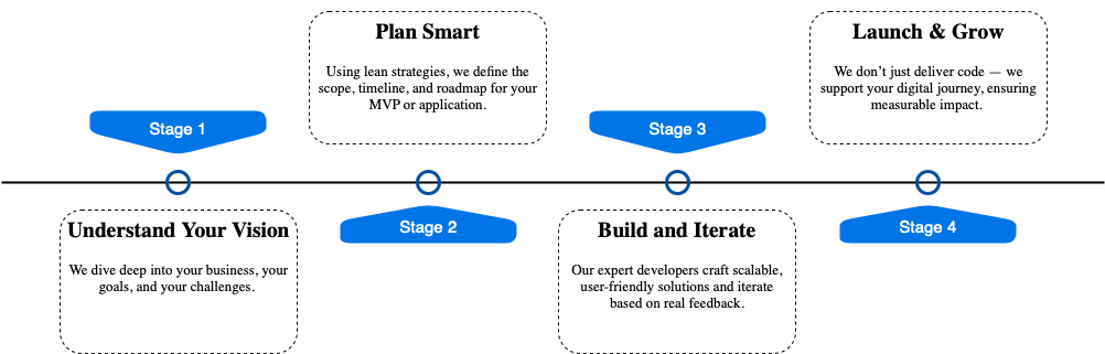 We exist to simplify the journey from idea to execution. Startups get their MVPs to market quickly, and SMEs gain custom applications that optimize operations — all without the usual headaches of tech development.